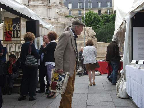 It’s the 30th Marché de la Poésie and it takes place in the tree shaded square by the newly renovated church of Saint Sulpice, Paris. There are hundreds of publishing houses represented here, some well known, some small, all selling volumes of poetry – though there are also a few works of prose to be found. The canvas covered stalls often have more than one publisher sharing a marquee. They flank the elegant stone fountain in the middle of the square, and are bordered by trees on three sides. This gives a sheltered and intimate feeling to the space, drawing booksellers and the wandering public into a complicity with the rustling leaves and warm summer sunshine.