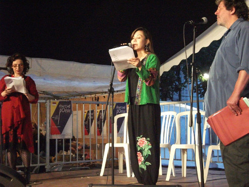 Jacques Rancourt is the editor of the magazine and has set up Festrad, Festival de la Poésiefranco-anglaise, part of the Marché de la Poésie. He has been dedicated to this for over two decades, and has also brought in artists and musicians, working around the varied themes which are presented each year. This year’s theme was ‘The Poetic Attention.’ Fifty poems and 20 essays are included in the latest issue of La Traductiere, by writers from several different countries. Several poets from Singapore were among the invited guests and read from their work in the evenings, on the central stage close to the carved lions of the stone fountain.